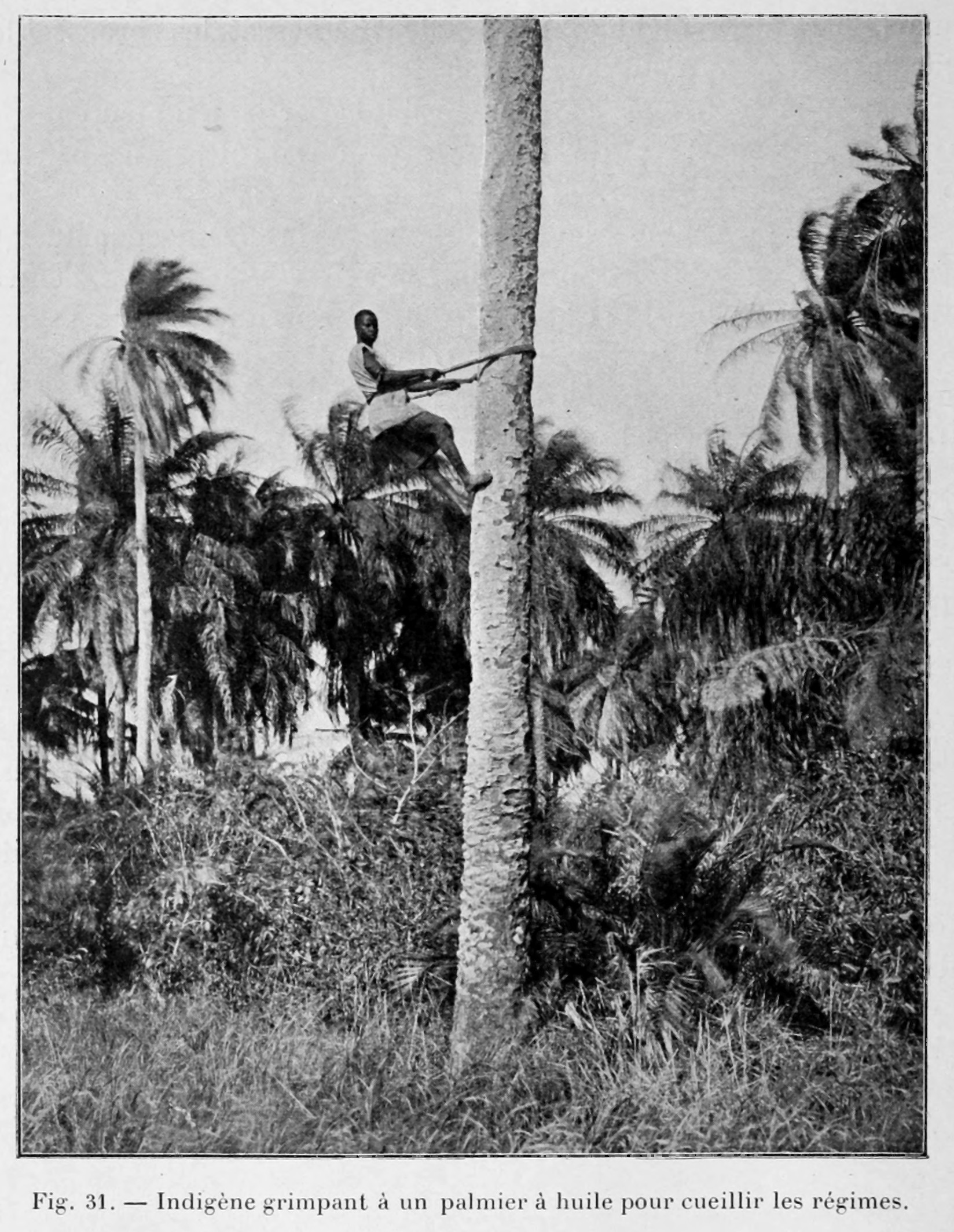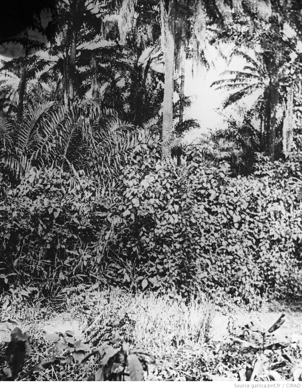 Photography in the late 19th and early 20th centuries was not well equipped to document flat, tree-filled landscapes. These photos show glimpses of oil palms and their surroundings. Take note of the sheer height of mature palms: climbing these trees to cut fruit was the single biggest obstacle to making palm oil before the plantation arrived.