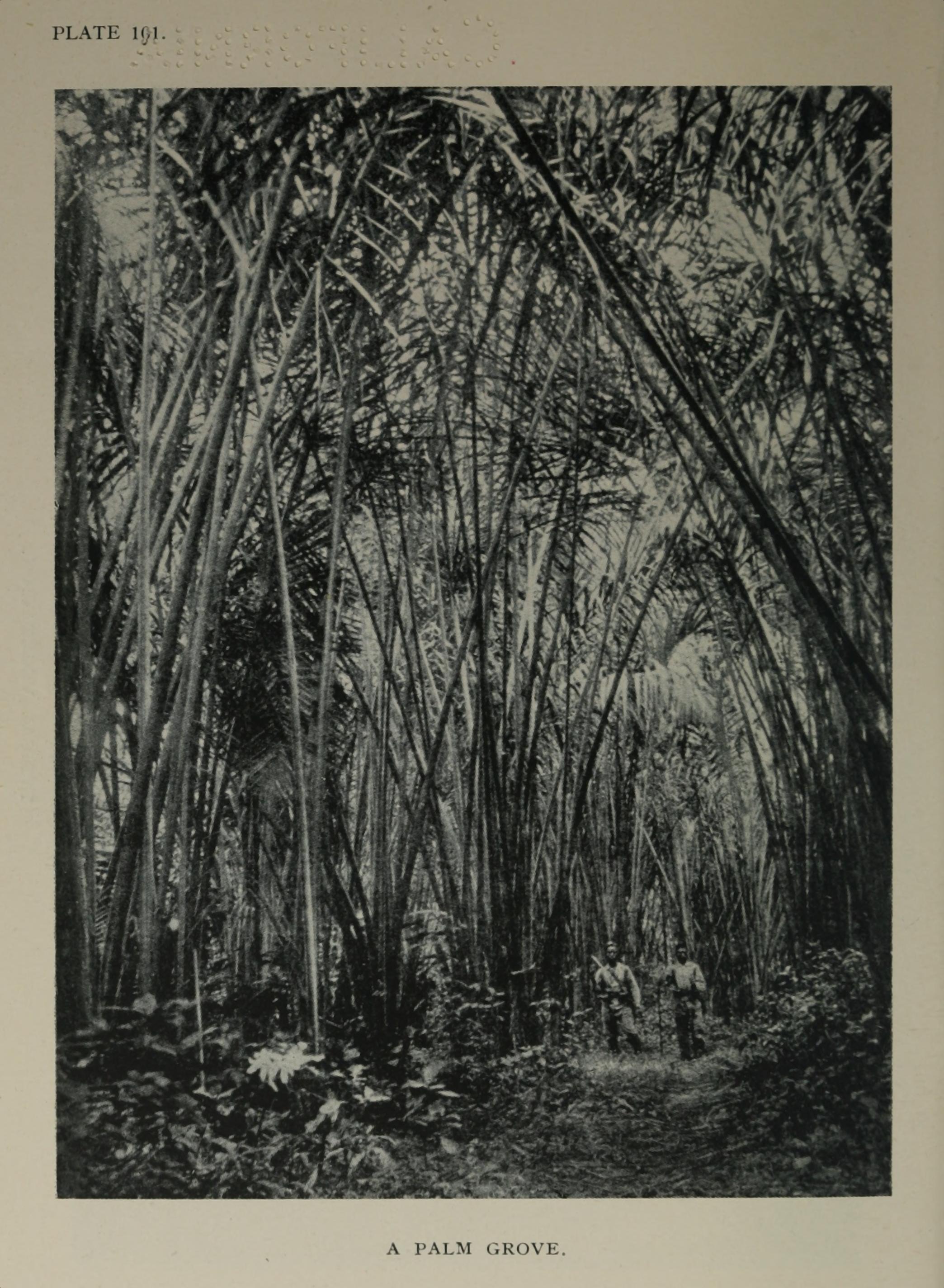 Oil palms are native to western Africa, but most groves were—contrary to what you’ll often read—not wild. For nearly 500 years, European writing about oil palms talked about “forests,” but oil palms are not true forest species. In places wet enough to support what most of us imagine is a real rainforest, deciduous giants shade out oil palms. The “forests” and “groves” depicted below were in fact secondary growth, following human agriculture. As one early-20th century botanist argued, they’re better understood as orchards in need of some pruning, rather than wild forest environments.