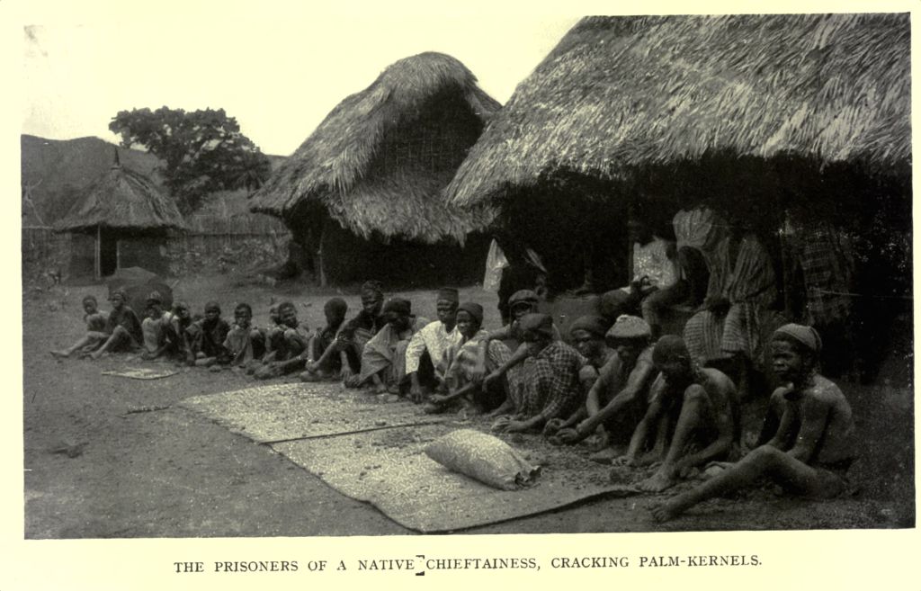 Enslaved men cracking palm kernels with rocks (Beatty, 1915)